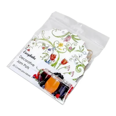 The NJ Products Floral Jam Pot Covers With Matching Labels are supplied in a pack of 20.Decorated in a bright and colourful floral design. The kit contains wax discs, cellophane discs, matching labels and bands for 20 jam pots.Made in the UK.