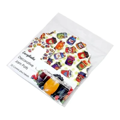 The NJ Products Jam Pot Covers With Jam Jar Labels are supplied in a pack of 20.Decorated in a bright and colourful gingham background with tiny jam pot illustrations. The kit contains wax discs, cellophane discs, matching labels and bands for 20 jam pots.Made in the UK.