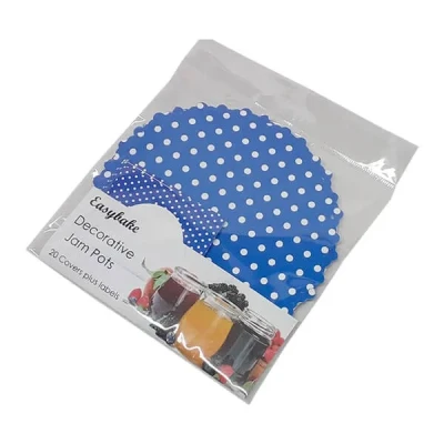 The NJ Products Polka Dot Blue Jampot Covers is supplied in a pack of 20 and includes a matching set of self adhesive labels to personalise your homemade jams and jellies.The pack also includes wax discs, cellophane discs and bands.Made in the UK.