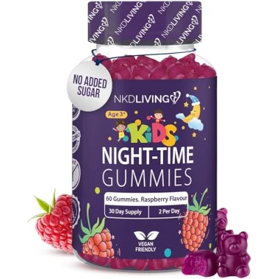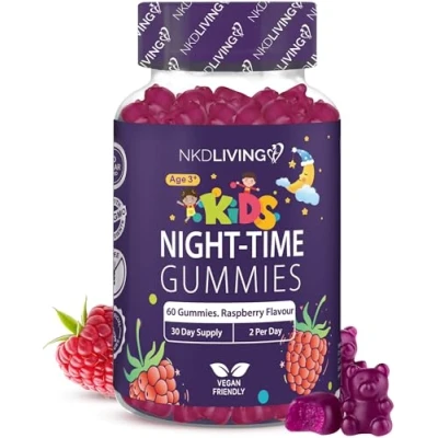 NKD Living Kids Night Time Gummies No Added Sugar Natural Sleep Support with Magnesium, Chamomile & Lemon Balm Calm Relaxation for Children Non GMO, Vegan Gluten Free 60