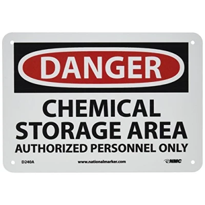 Danger Signage: the danger sign is commonly used in industrial facilities and laboratories to inform that the indicated area is for the storage of chemicals and can pose danger to unauthorized entry Material: the signage is made from standard aluminum with baked-on enamel on both sides that allows printing on both sides. Non-corrosive and weatherproof, the sign has radius corners and pre-drilled mounting holes Clear Visibility: the sign displays the legend “DANGER - CHEMICAL STORAGE AREA - AUTHORIZED PERSONNEL ONLY” in clear, bold letters for clear visibility and readability even from a distance Product Specification: the rectangular aluminum danger sign is 0.0400 in. thick with 10 in. width and 7 in. height. The sign complies with OSHA standard and has White text on Red base with Black text on a White base Sign Muscle: this OSHA danger sign has an NMC Sign Muscle coating to protect the text against fading, scratches, scuffing, mold, and moisture. The UV-cured, clear coating creates a strong bond and also boosts the color and clarity