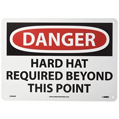 Danger Signage: it warns the visitors and workers to wear hard hat beyond a specific area. This OSHA signage helps to maintain a safe working environment and keep the people aware about potentially dangerous zone Visibility: the signage with legend DANGER - HARD HAT REQUIRED BEYOND THIS POINT is legible from a certain distance. The letters are simple and clearly visible; it can be placed easily across the busy construction area and commercial premises Material: the sign is made from Standard Aluminum with baked-on enamel on both sides for both side printing. Non-corrosive and weatherproof sign has radius corners and pre-drilled mounting holes. It offers indoor/outdoor applications on a wall or fence Specifications: this lightweight and 0.040 in. thick aluminum danger sign features clear bold black/white text on white/red base and measures 14 in. length by 10in. height Sign Muscle: this danger sign has NMC Sign Muscle coating that protects the text and image against fading, scratches, scuffing, graffiti and mold. The UV-cured, clear coating creates a strong bond and boosts the color and clarity