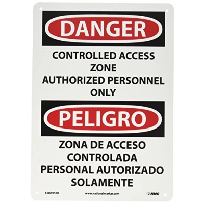 NMC ESD695RB Bilingual OSHA Sign, Legend "DANGER CONTROLLED ACCESS ZONE AUTHORIZED PERSONNEL ONLY", 10" Length x 14" Height, Rigid Plastic, Black/Red on White
