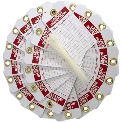 Wording: "LADDER INSPECTION" 0.015 Unrippable vinyl Unwrippable and write on With brass grommets Measures 3-inches length by 6-inches height