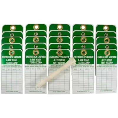 Front and back of tag reads, "Emergency Shower & Eye Wash Test Record" followed by a blank grid for writing inspection data Blank grid has four columns with headers that read "Date," "By," "Date," and "By" 15 mil vinyl is water and chemical resistant 6 x 3" tag includes 3/8" diameter hole with reinforced brass grommet for longer wear and an 8" one-piece nylon cable tie for attachment Tensile strength of 6,300 psi to help resist unauthorized removal