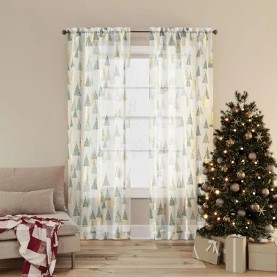 Christmas tree printed design complements holiday decor Elegant sheer fabric Gently filters light Rod pocket design fits rods up to 1.5" in diameter Machine washable Each panel sold separately. (Image features 2 panels)