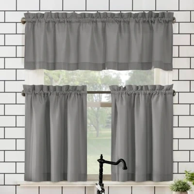 Soft microfiber fabric Gently filters light while enhancing privacy Rod pocket design allows for easy hanging on a standard curtain rod Machine washable Also ideal for bathroom windows.Includes 1 valance and 2 tier curtains