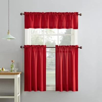 No. 918 Martine Microfiber Semi Sheer Rod Pocket Kitchen Curtain Valance and Tiers Set, 54" x 36", Red