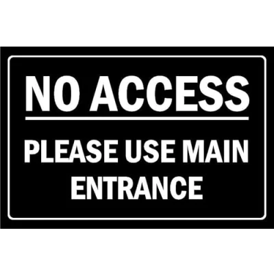 No access, please use main entrance. 1mm flexible Plastic sign. Digitally printed for extra durability. Drill and screw in position or use double sided tape to mount onto suitable surface. All signs come with a 5-year warranty. All our signs are UV resistant meaning they will not fade in sunlight. Suitable for indoor & outdoor use.