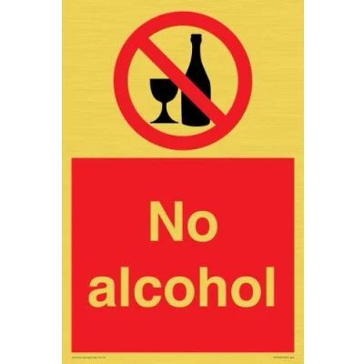 P907 : No alcohol This sign is made from vinyl gold sticker Gold metal effect sticker for flat, clean surfaces. Not for rough, plastic, or dusty surfaces. A4 portrait Sign Text: No alcohol