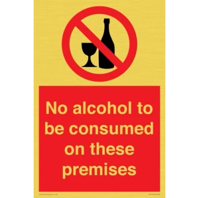 P907 : No alcohol This sign is made from vinyl gold sticker Gold metal effect sticker for flat, clean surfaces. Not for rough, plastic, or dusty surfaces. A4 portrait Sign Text: No alcohol to be consumed on these premises