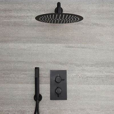 General description Accentuated by a stunning black finish, the modern Milano Nero two outlet shower system is designed to enhance your bathroom with style and provide a luxurious showering experience. This system includes a twin diverter thermostatic shower valve, a wall-mounted 300mm round rainfall shower head, and an ergonomic hand shower handset kit. Technical specifications Material: Solid brass valve with ceramic disc technology Shower head: 300mm round anti-corrosive stainless steel Hand shower: Brass with a 1.75m smooth hose Minimum recommended pressure: 1.0 bar Finish: Matte black powder coated Warranty: 10 years Installation Wall-mounted installation Includes outlet elbow and bracket Usage Intuitive round handles for easy temperature and flow adjustment Diverter for switching between shower head and hand shower Silicone nozzles for easy cleaning and limescale removal Other information Integral anti-scald technology for safe showering Refreshing rainfall water coverage for a