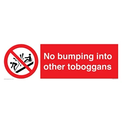 P047 : Do not ram into toboggans This sign is made from vinyl / sticker Air Release vinyl makes it easy to stick to flat, clean surfaces without bubbles. Not for rough, plastic or dusty surfaces. 41 landscape Sign Text: No bumping into other toboggans