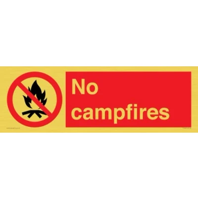 P045 : No campfire This sign is made from vinyl gold sticker Gold metal effect sticker for flat, clean surfaces. Not for rough, plastic, or dusty surfaces. 62 landscape Sign Text: No campfires