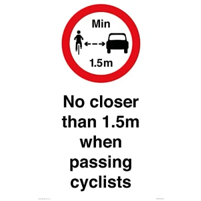 RP902 : No closer than 1.5m when passing cyclists This sign is made from vinyl / sticker Air Release vinyl makes it easy to stick to flat, clean surfaces without bubbles. Not for rough, plastic or dusty surfaces. A2 portrait Sign Text: No closer than 1.5m when passing cyclists