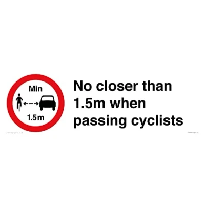 RP902 : No closer than 1.5m when passing cyclists This sign is made from vinyl / sticker Air Release vinyl makes it easy to stick to flat, clean surfaces without bubbles. Not for rough, plastic or dusty surfaces. 41 landscape Sign Text: No closer than 1.5m when passing cyclists