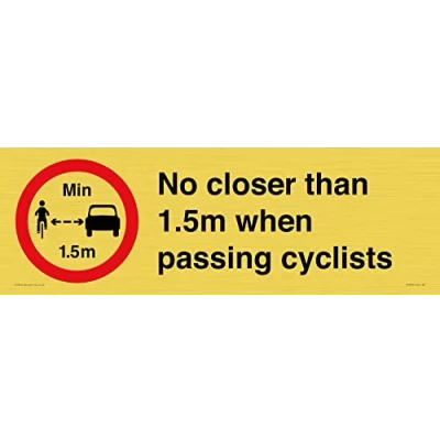 RP902 : No closer than 1.5m when passing cyclists This sign is made from vinyl / sticker Air Release vinyl makes it easy to stick to flat, clean surfaces without bubbles. Not for rough, plastic or dusty surfaces. 62 landscape Sign Text: No closer than 1.5m when passing cyclists
