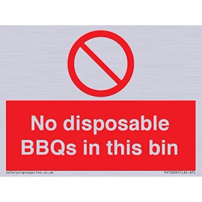 P001 : General Prohibition This sign is made from vinyl silver sticker A7 landscape Sign Text: No disposable BBQs in this bin