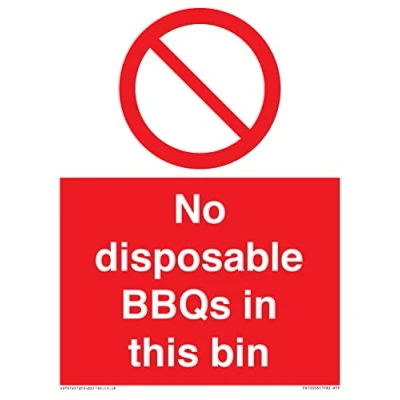 P001 : General Prohibition This sign is made from vinyl / sticker Air Release vinyl makes it easy to stick to flat, clean surfaces without bubbles. Not for rough, plastic or dusty surfaces. A5 portrait Sign Text: No disposable BBQs in this bin