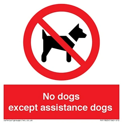 P021 : No dogs This sign is made from vinyl / sticker Air Release vinyl makes it easy to stick to flat, clean surfaces without bubbles. Not for rough, plastic or dusty surfaces. S10 square Sign Text: No dogs except assistance dogs