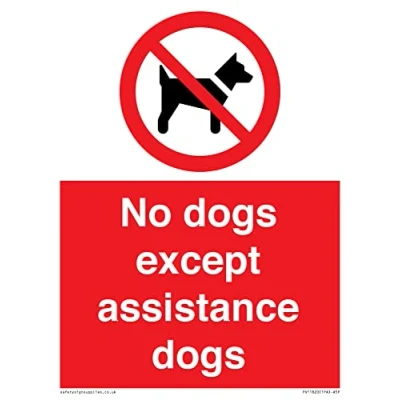 P021 : No dogs This sign is made from vinyl / sticker Air Release vinyl makes it easy to stick to flat, clean surfaces without bubbles. Not for rough, plastic or dusty surfaces. A5 portrait Sign Text: No dogs except assistance dogs
