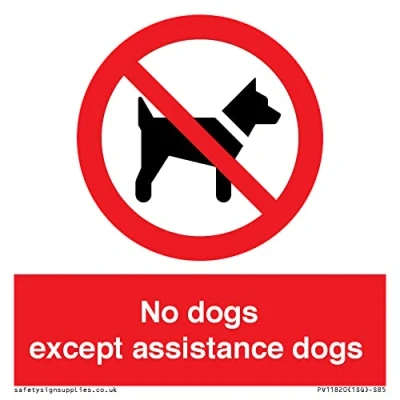 P021 : No dogs This sign is made from plastic rigid 3mm 3mm plastic sign with foam core. Can be screwed, stuck with adhesive or hung with a hanging kit. Not suitable for cable ties. S85 square Sign Text: No dogs except assistance dogs