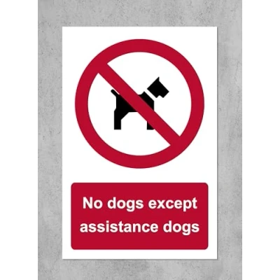 No dogs except assistance dogs sign Self adhesive sticker 200mm x 150mm Digitally printed and laminated for extra durability Remove backing film and apply to dry, smooth, oil free surface.