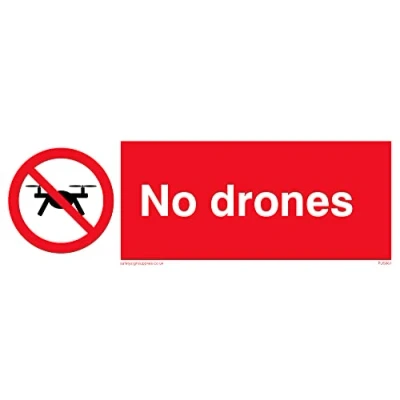 Prohibition no drones This sign is made from vinyl high tack A stickier sticker. Uses a stronger adhesive to make it more suitable for plastic surfaces like Wheelie Bins or where the sticker might get rubbed. 15 landscape Sign Text: No drones with drone prohibition symbol