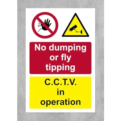 No dumping or fly tipping CCTV in operation Safety sign 3mm Aluminium sign 300mm x 200mm Digitally printed and laminated for extra durability 10mm Radius rounded corners, no sharp edges