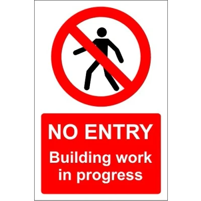 NO ENTRY Building work in progress sign Self adhesive vinyl 300mm x 200mm Digitally printed and laminated for extra durability Remove backing film and apply to dry, smooth, oil free surface.