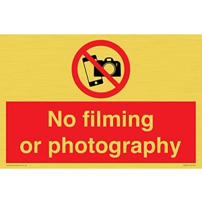 P932 : No filming or photography This sign is made from vinyl gold sticker Gold metal effect sticker for flat, clean surfaces. Not for rough, plastic, or dusty surfaces. A4 landscape Sign Text: No filming or photography