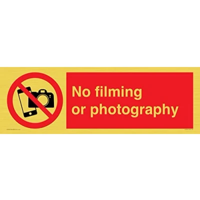 P932 : No filming or photography This sign is made from vinyl gold sticker Gold metal effect sticker for flat, clean surfaces. Not for rough, plastic, or dusty surfaces. 62 landscape Sign Text: No filming or photography