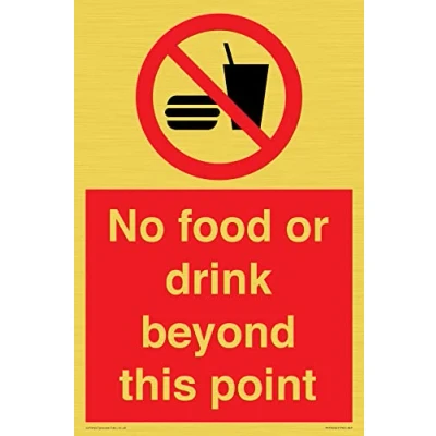 P022 : No eating or drinking This sign is made from vinyl gold sticker Gold metal effect sticker for flat, clean surfaces. Not for rough, plastic, or dusty surfaces. A4 portrait Sign Text: No food or drink beyond this point