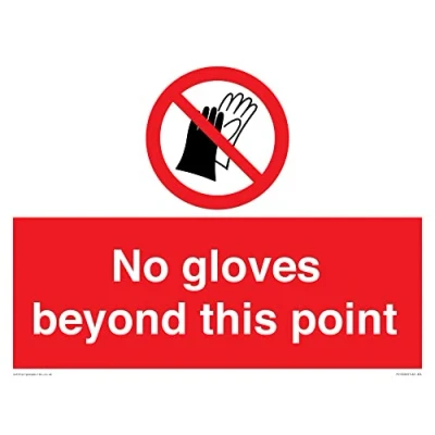P028 : Do not wear gloves This sign is made from vinyl / sticker Air Release vinyl makes it easy to stick to flat, clean surfaces without bubbles. Not for rough, plastic or dusty surfaces. A3 landscape Sign Text: No gloves beyond this point