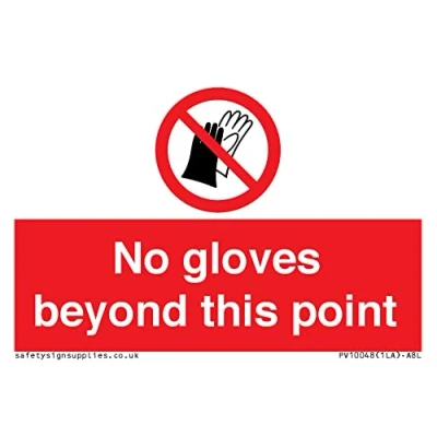P028 : Do not wear gloves This sign is made from vinyl / sticker Air Release vinyl makes it easy to stick to flat, clean surfaces without bubbles. Not for rough, plastic or dusty surfaces. A8 landscape Sign Text: No gloves beyond this point