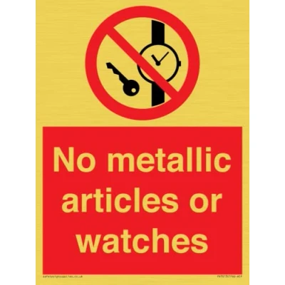 P008 : No metallic articles or watches This sign is made from vinyl gold sticker Gold metal effect sticker for flat, clean surfaces. Not for rough, plastic, or dusty surfaces. A5 portrait Sign Text: No metallic articles or watches
