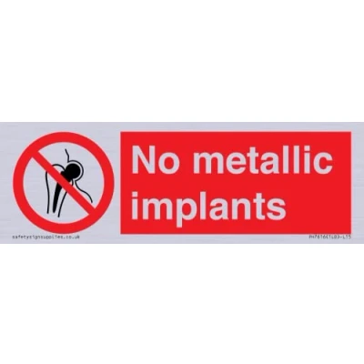 P014 : No access with metallic implants This sign is made from vinyl silver sticker 15 landscape Sign Text: No metallic implants