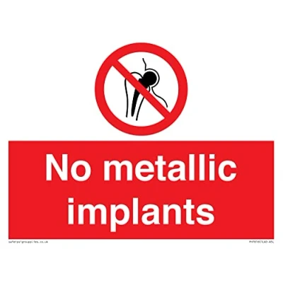 P014 : No access with metallic implants This sign is made from vinyl / sticker Air Release vinyl makes it easy to stick to flat, clean surfaces without bubbles. Not for rough, plastic or dusty surfaces. A5 landscape Sign Text: No metallic implants