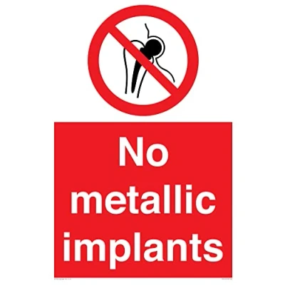 P014 : No access with metallic implants This sign is made from vinyl / sticker Air Release vinyl makes it easy to stick to flat, clean surfaces without bubbles. Not for rough, plastic or dusty surfaces. A2 portrait Sign Text: No metallic implants