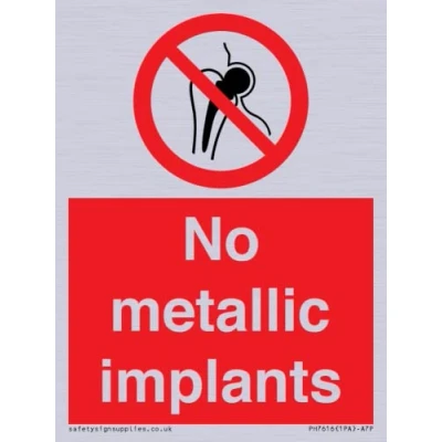 P014 : No access with metallic implants This sign is made from vinyl silver sticker A7 portrait Sign Text: No metallic implants