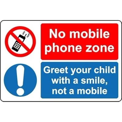No mobile phone zone. Great your child with a smile not a mobile Sign 1mm Plastic sign Digitally printed for extra durability Drill and screw in position or use double sided tape to mount onto suitable surface.
