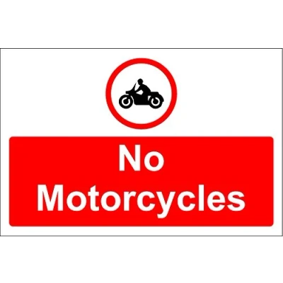 No motorcycles sign 1.2mm rigid plastic 400mm x 300mm Digitally printed and laminated for extra durabillity Drill and screw in position or use double sided tape to mount onto suitable surface.