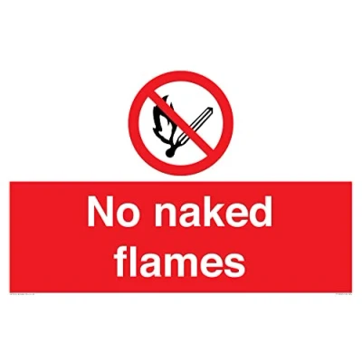 P003 : No open flame This sign is made from vinyl / sticker Air Release vinyl makes it easy to stick to flat, clean surfaces without bubbles. Not for rough, plastic or dusty surfaces. A2 landscape Sign Text: No naked flames
