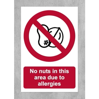 No nuts in this area due to allergies prohibition sign. 1mm flexible Plastic sign. Digitally printed for extra durability. Drill and screw in position or use double sided tape to mount onto suitable surface. All signs come with a 5-year warranty. All our signs are UV resistant meaning they will not fade in sunlight. Suitable for indoor & outdoor use.