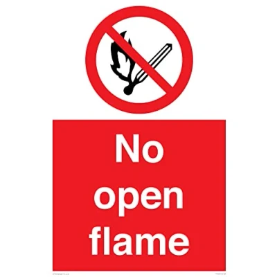 P003 : No open flame This sign is made from vinyl / sticker Air Release vinyl makes it easy to stick to flat, clean surfaces without bubbles. Not for rough, plastic or dusty surfaces. A2 portrait Sign Text: No open flame