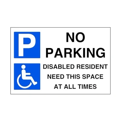 No parking disabled resident need this space at all times signs 1.2mm Rigid plastic for indoor/outdoor usage (300mm x 200mm) Viewing Distance within 7m.