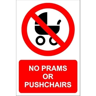 No prams or pushchairs. 1mm flexible Plastic sign. Digitally printed for extra durability. Drill and screw in position or use double sided tape to mount onto suitable surface. All signs come with a 5-year warranty. All our signs are UV resistant meaning they will not fade in sunlight. Suitable for indoor & outdoor use.