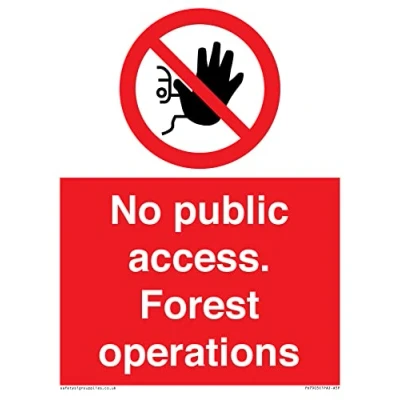 P905 : No access This sign is made from vinyl / sticker Air Release vinyl makes it easy to stick to flat, clean surfaces without bubbles. Not for rough, plastic or dusty surfaces. A5 portrait Sign Text: No public access. Forest operations