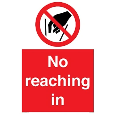 P015 : No reaching in This sign is made from vinyl / sticker Air Release vinyl makes it easy to stick to flat, clean surfaces without bubbles. Not for rough, plastic or dusty surfaces. A2 portrait Sign Text: No reaching in