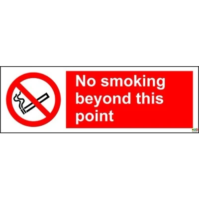 no smoking beyond this point sign 1.2mm rigid plastic 300mm x 100mm Digitally printed and laminated for extra durability Drill and screw in position or use double sided tape to mount onto suitable surface.